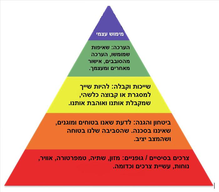 הסבר הפירמידה: האדם שואף להגיע תמיד לפסגת הפירמידה. בדרך, עליו להשיג את כל אחד מהשלבים המצויים. החל מלהשיג צרכים בסיסיים בחייו, קרי מזון, שתייה, אוויר, להתקלח ועוד. לאחר מכן, שיצבור ביטחון והגנה בחייו ושאינו בסזכנה ושהוא בסביבה מתאימה והולמת לחייו. שייכות וקבלה זוהי הרמה השלילשית, להיות שייך למסגרת כלשהי ולקבוצה שתקבל אותו. ולסיום, הערכה עצמית ומימוש עצמי ברמות הגבוהות.